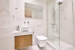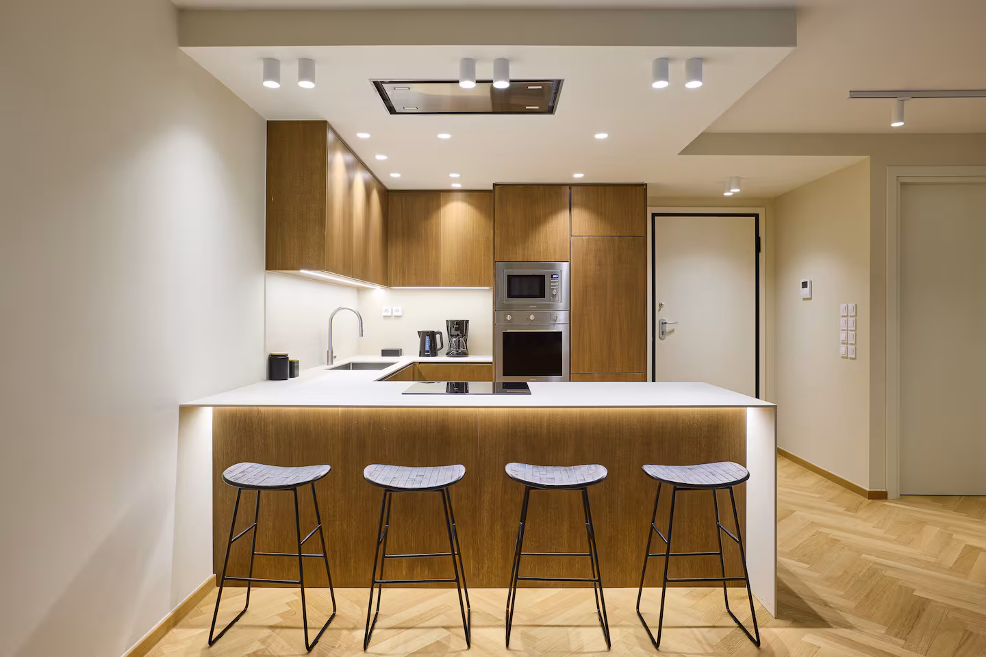 All our apartments share similar style and design. Upon entering, you’ll be greeted by a spacious living area that exudes warmth and style. The open-plan design seamlessly integrates the living, dining, and kitchen areas, creating a harmonious flow that is perfect for both relaxation and entertainment. Large windows invite natural light to flood the space, offering garden or city views.